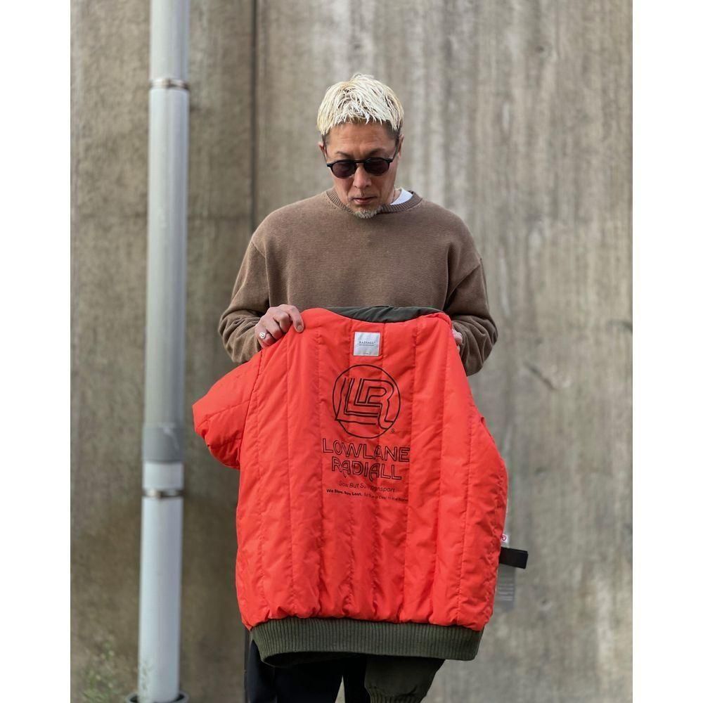 オレンジの裏地には縦方向のキルティングステッチが入り、ロゴがスクリーンプリントで入っています。